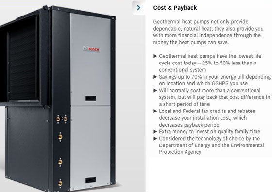 Geothermal systems, also known as heat pumps, made by Bosch, are the most energy and cost efficient systems on the market and therefore the greenest technology for heating and cooling. This is one of the many reasons that Bosch equipment is the only geothermal product line that Owens Comfort Systems will install. Geothermal technology uses the relatively constant temperature of the earth (thermal energy) to provide heating, air conditioning and hot water. Ground and water temperatures, 6 feet below the earth's surface, stay relatively constant throughout the year. This allows the system to provide extremely efficient heating or cooling all year long in virtually any climate. Sometimes the term "environmental comfort system" is used to describe a geothermal heat pump. This term is used because a geothermal heat pump absorbs or rejects heat from the earth and has absolutely no impact on the environment.